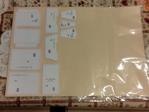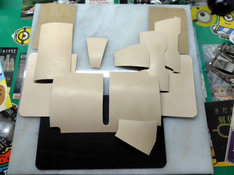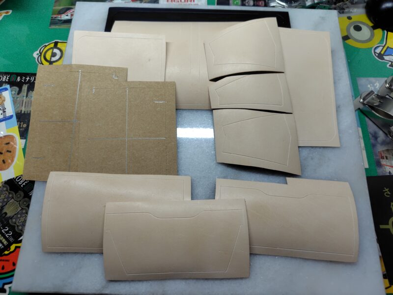 型紙が出来て材料がそろったので、形紙を革に写して裁断していきます。