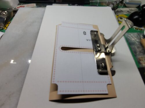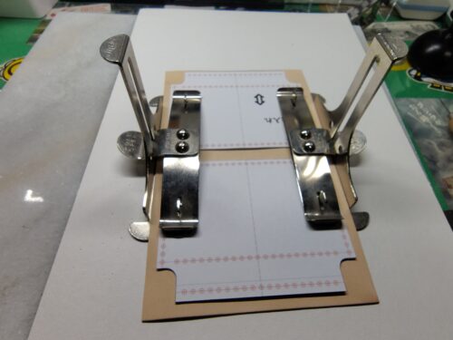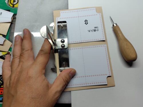 革と型紙の片方を立ちクリップで固定して、ケガキます。
