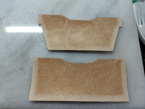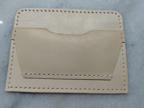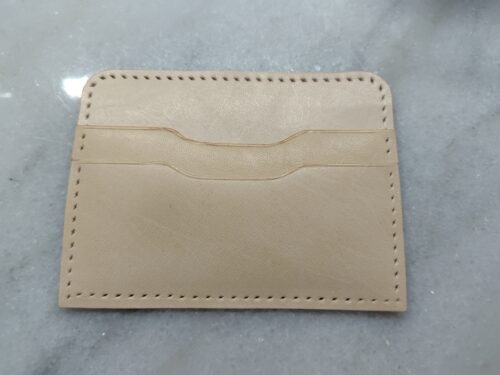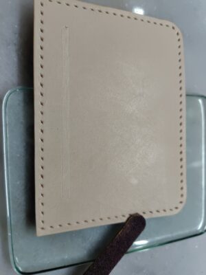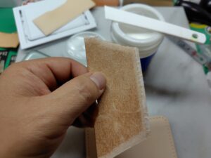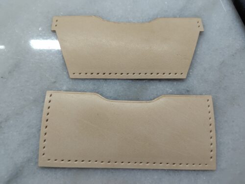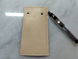 手順はカードケースとほぼ一緒で、コバを磨いて、ヘリを漉いて、菱目打ちをして張り付けていますので、ここらは端折ります。