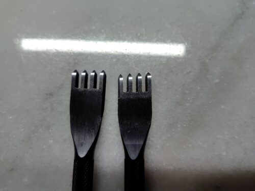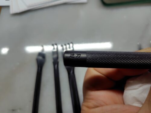 そのため、逆刃という菱目の角度が逆になっている菱目打ちを用意しています。
