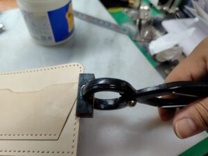ナスカン・カシメをセットして、ここも必殺技ハンディプレスで締めます。