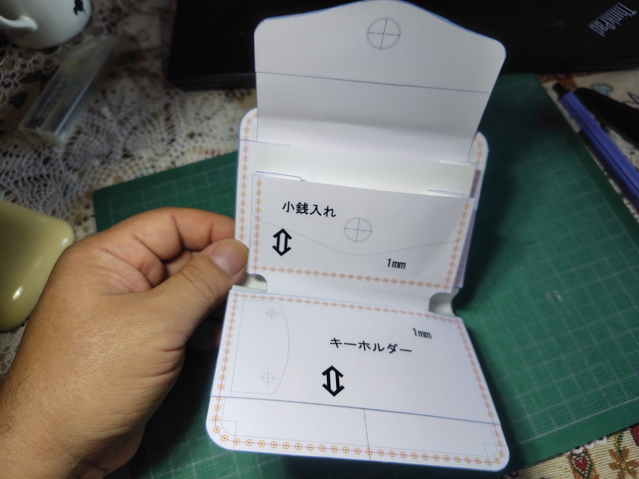 サイズをカード1枚分プラス取り出しスペースにして、お札入れと小銭入れを覆う蓋を付けました。