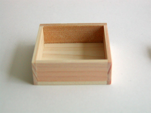 オリジナルをつくるぞ!-引き出し ドールハウス 2009.07.242025.06.13 引き出しを組み立てました。引き出し大は、前面の板が厚さ3mmのアガチス、その他は2mmのヒノキで作っています。引き出し小は、すべて2mmのヒノキです。前面の板は後でニスを塗るので、はずせるように少量のボンドで仮止めしてあります。後ろから見たところ底です。慎重にヤスリがけして寸法を合わせたので、綺麗に仕上がったと思います。器用さはいりません、根気だけです。明日は、本体の下段を作ります。